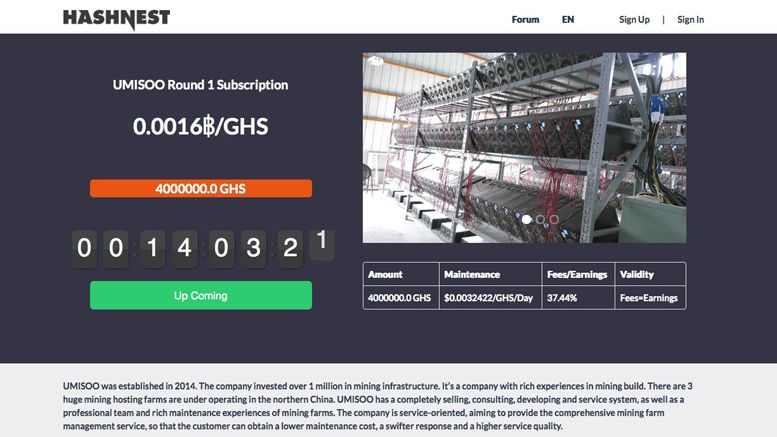 UMISOO, the first Operator on HASHNEST will provide 4PH/s hashing power, and plan to start the Round 1 subscription on 2nd September, 2014. Official subscribed flat price is 0.0016 BTC/Gh/s, restricted purchasing amount is maximum 1,000Gh/s for each user. The Round 1 hash rate is generated by AntMiner S2 with the maintenance fee of $0.00323/GH/s/Day.
