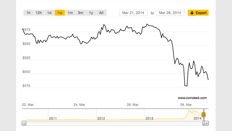 The price of bitcoin on the CoinDesk Bitcoin Price Index (USD BPI) remained below $500 on Friday 28th March, amid continued uncertainty over whether the Chinese government would seek to prohibit banks from working with digital currency exchanges. Sources in China indicated that the reports, which first surfaced on 27th March, appear to be true, though the People's Bank of China, the country's central bank, has yet to give any formal indication that its position on bitcoin and other digital currencies has shifted. At press time, the price of bitcoin had recovered slightly from an open of....