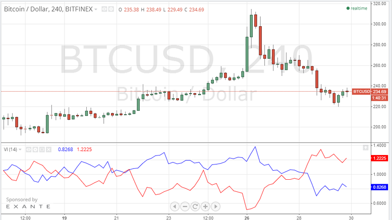 Bitcoin price fell to test the $230 support line yesterday, yet the $230 line seems to support the price well, as the price started rising again after testing the $230 support line to score around $237 at the time of the writing of this article. By studying the 4 hour Bitfinex (BTC/USD) chart from tradingview.com and plotting the Vortex Indicator (VI) (look at the below chart), we can notice that the red downtrend line is still above the blue uptrend line, which is synchronizing with the current bearish trend. Reversal of the bearish trend will be inevitable when we can see:4 or more....