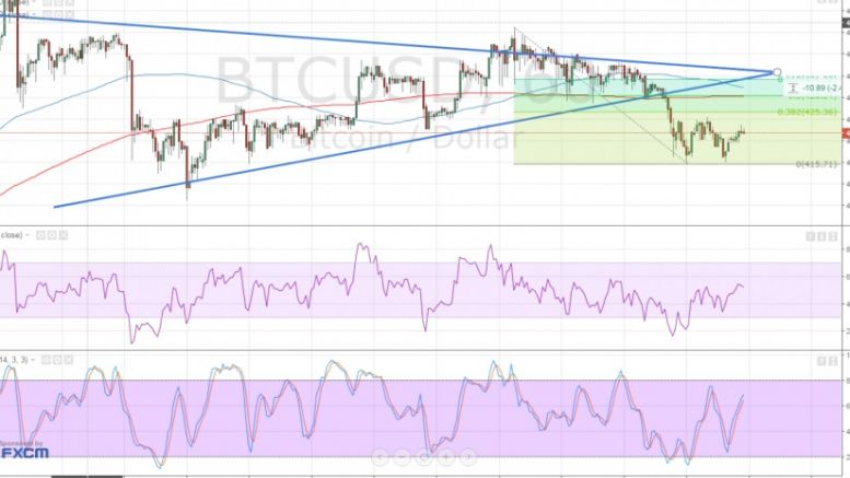 Bitcoin price could be due for more declines after making a downside break of consolidation and forming a reversal pattern. Technical indicators are suggesting a potential bounce for now, with the 100 SMA above the 200 SMA and oscillators moving out of the oversold levels. Both RSI and stochastic are also showing slight bullish divergences, hinting that buyers could come back in the game and trigger a pullback or rally for bitcoin price. A pullback could lead to a test of the broken triangle support near $430 and the moving averages, which might hold as dynamic inflection points. A larger....